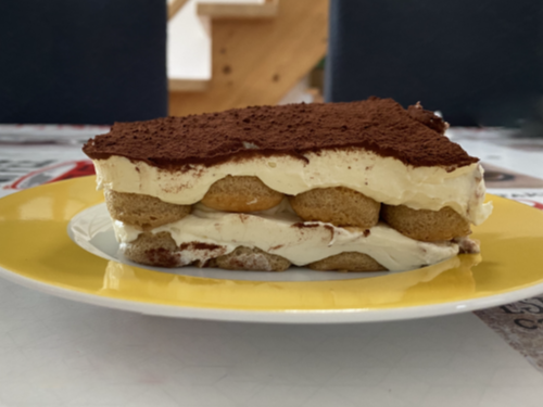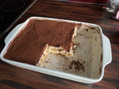 Biskuit jede Seite kurz in Espresso tunken, dann aufreihen (Zuckerseite oben)